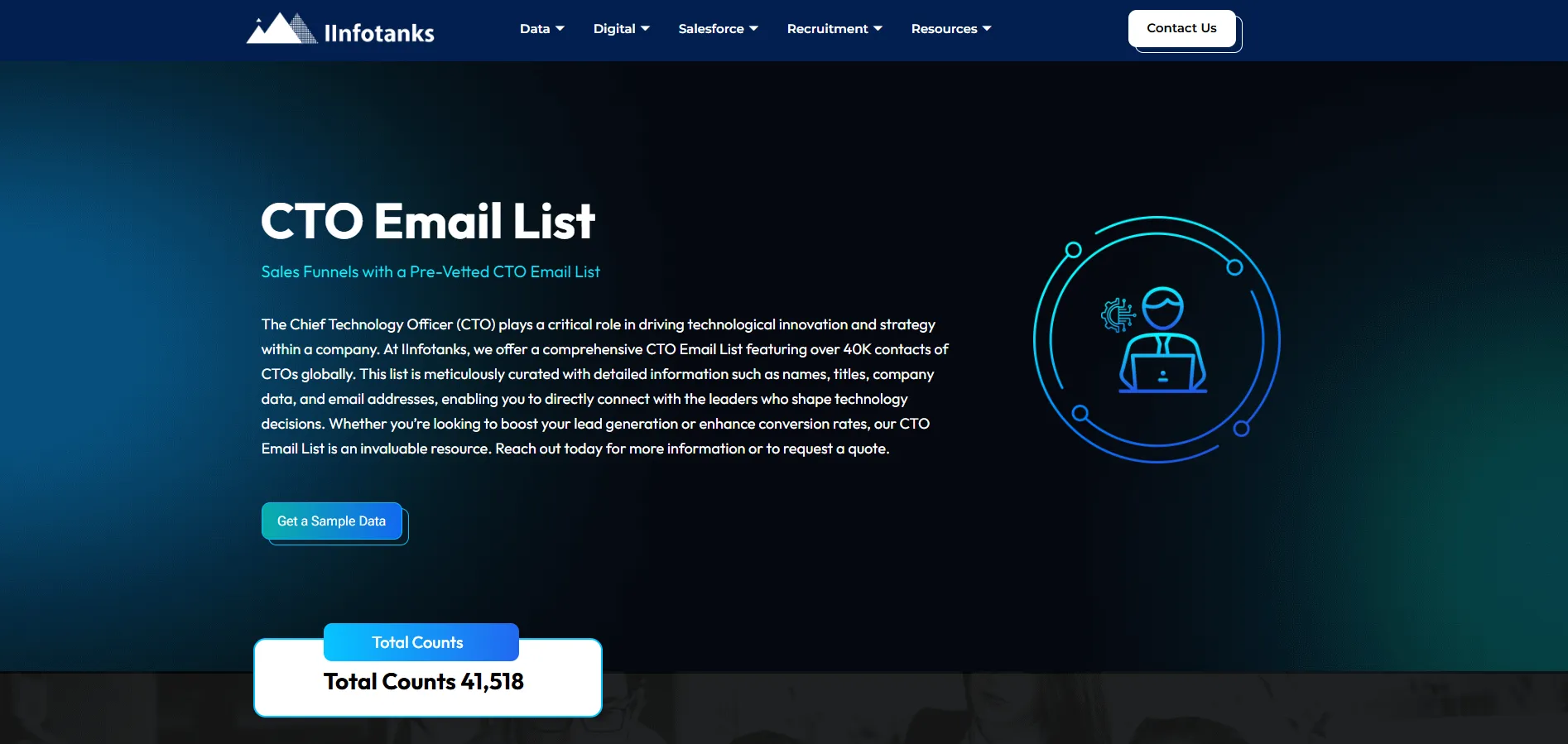 Infotanks provides email address lists compiled from business directories, partnerships, and data aggregation. The vendor offers contact databases for C-level executives with basic filtering by job title and company size. Free sample datasets allow quality evaluation before purchase.
