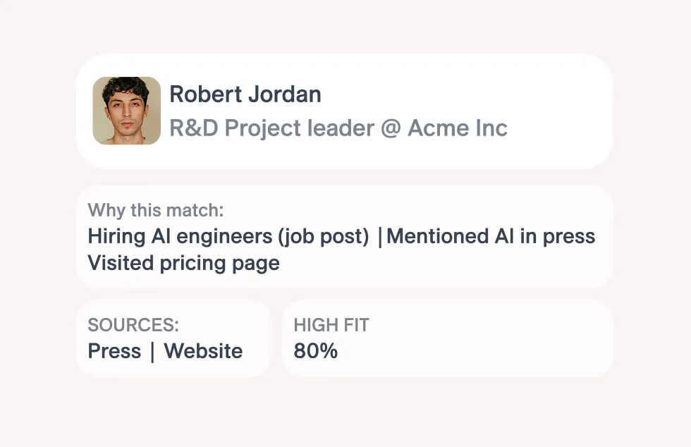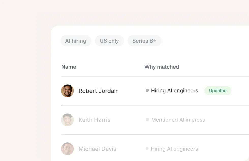 Build prospect lists from press releases, earnings reports, product launches, and leadership statements. Not static filters.
