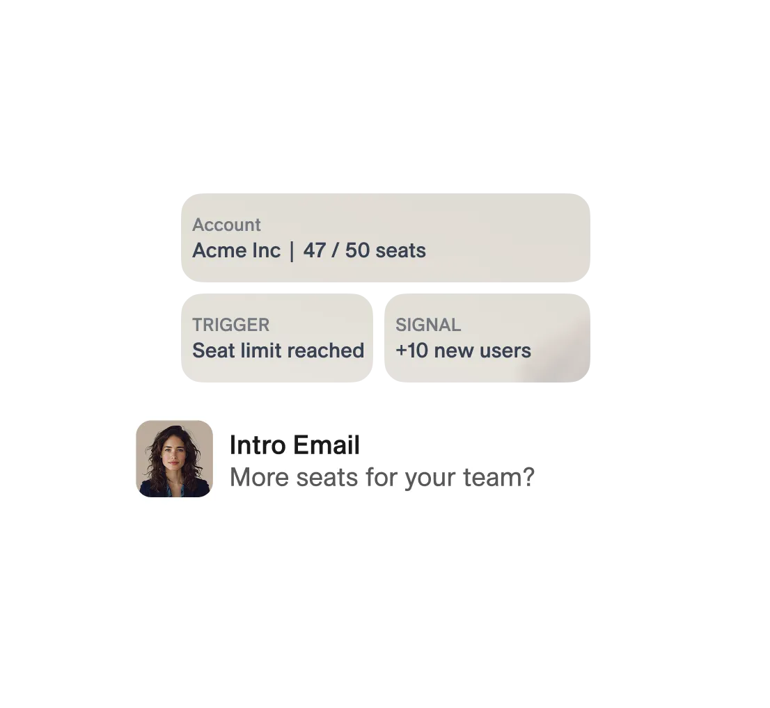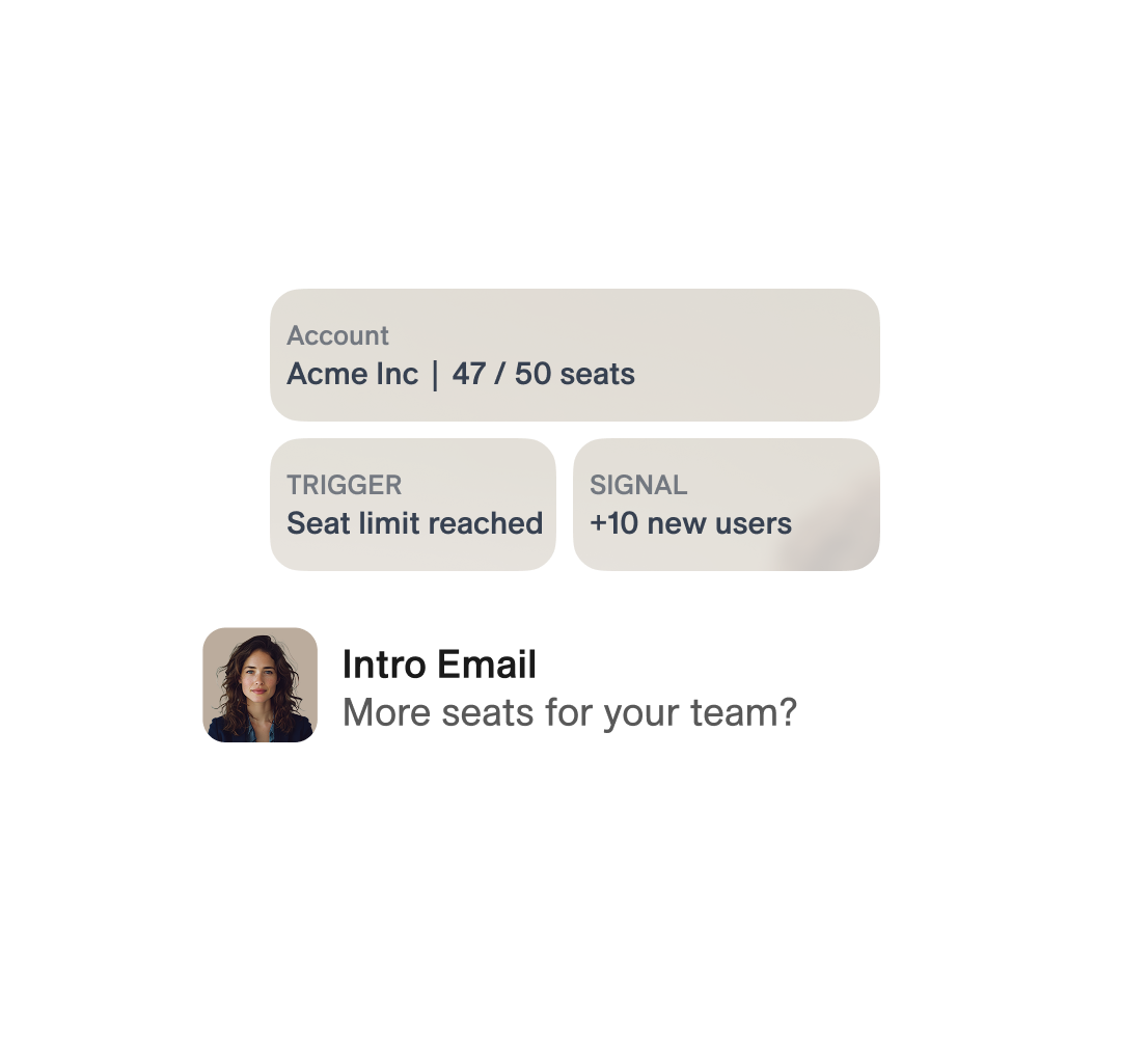 A team that maxed our seats gets a conversation about adding more. A customer using one product gets introduced to another. Relevant outreach because it’s based on actual behavior.