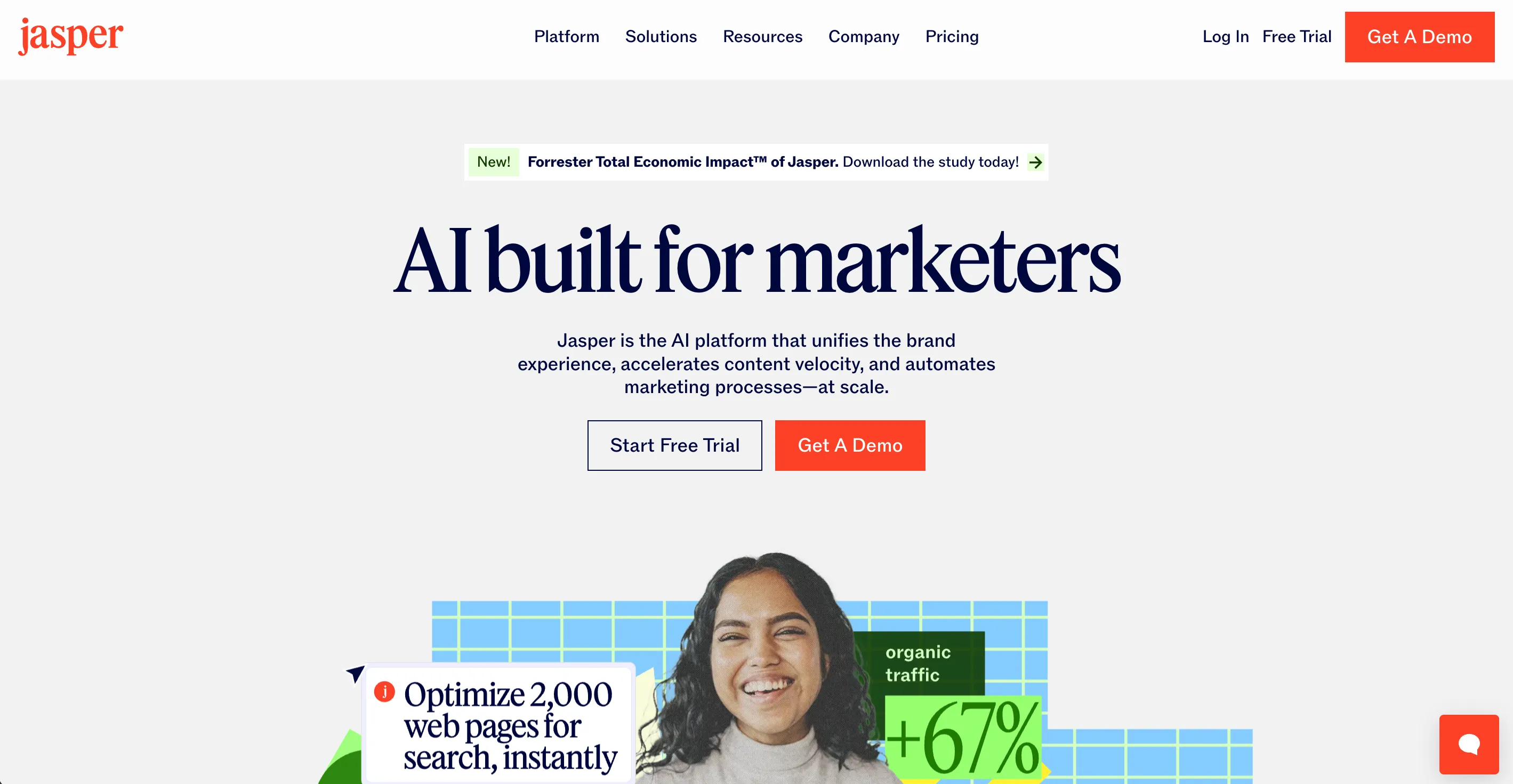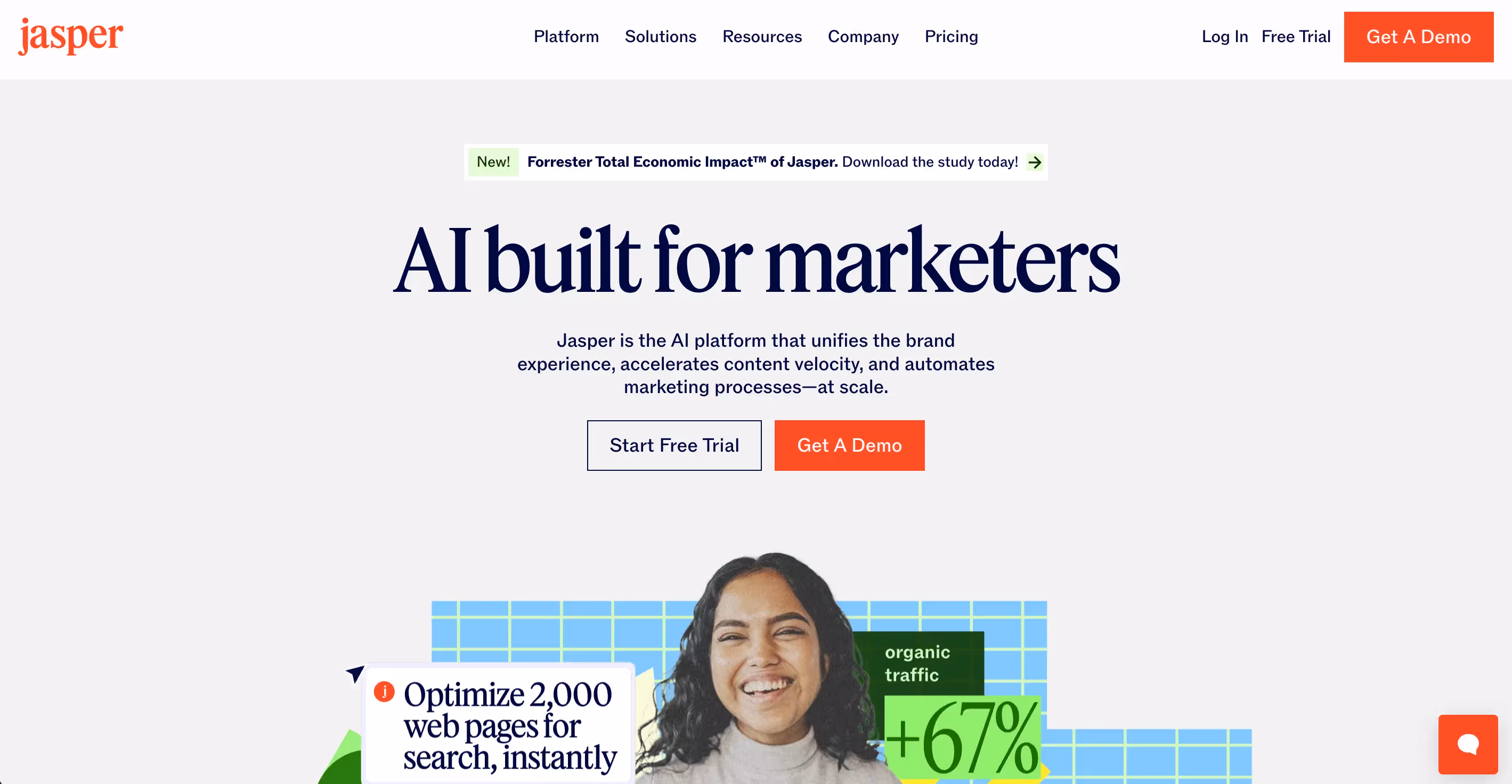 Jasper built its reputation as one of the first AI copywriting platforms and remains differentiated by its brand voice training. Unlike ChatGPT, Jasper lets teams upload style guides, company facts, and product catalogs, ensuring outputs stay on-brand.