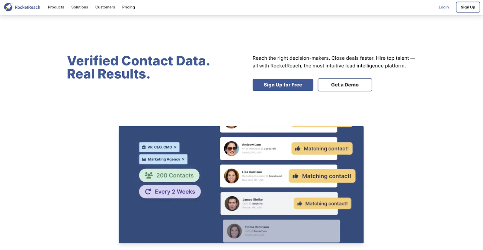 RocketReach aggregates business and personal contact details from social and web sources, linking email addresses to verified company domains. It’s a versatile, searchable database that suits recruiters and sales teams sourcing international prospects.