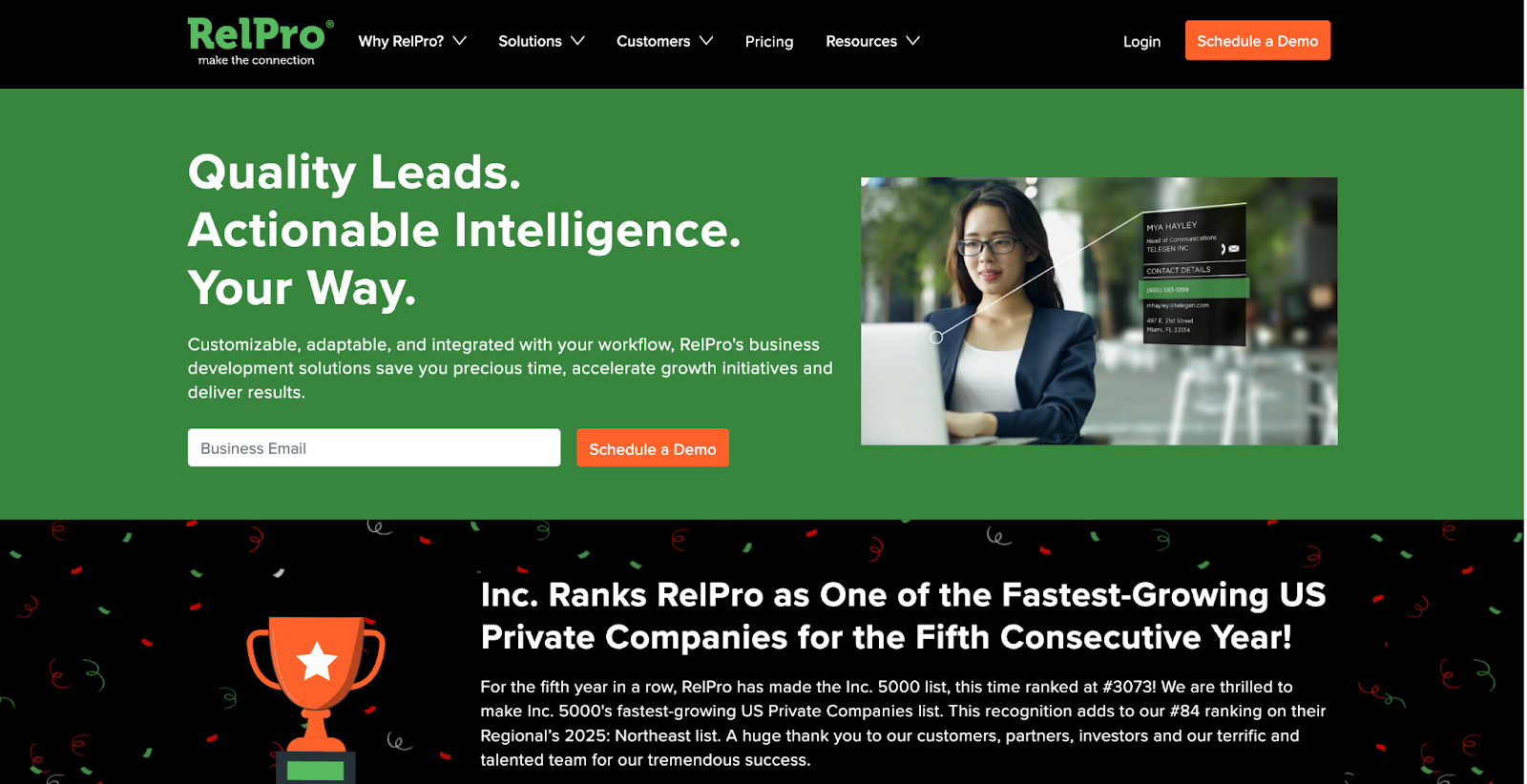 RelPro connects firmographic, demographic, and financial insights to map relationships across complex enterprise accounts. It visualizes executive ties and ownership structures, enabling reps to identify warm paths into decision‑makers.