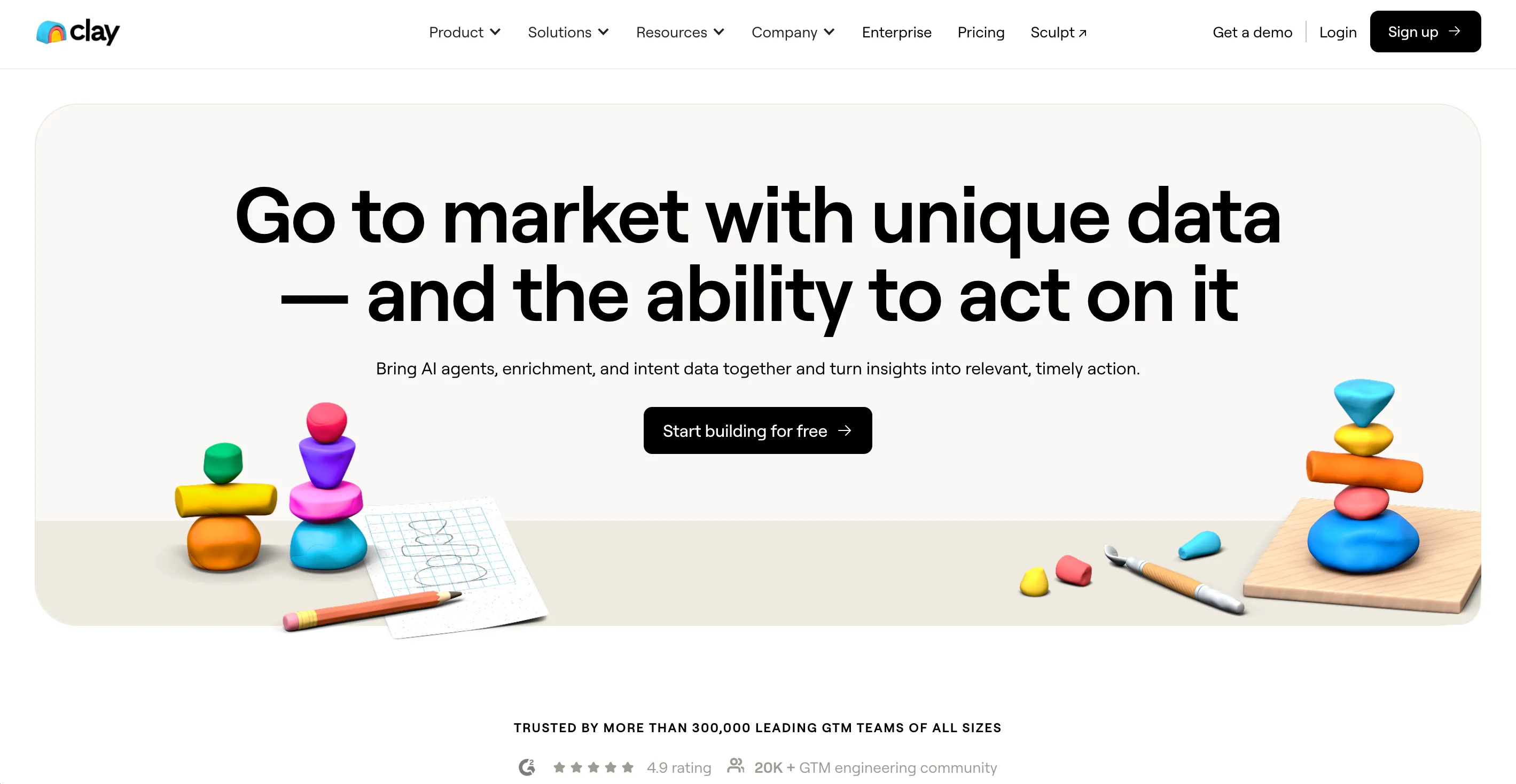Clay Data enrichment, research automation AI-powered prospecting and personalization API integrations with major CRMs Research and enrichment workflows Usage-based pricing