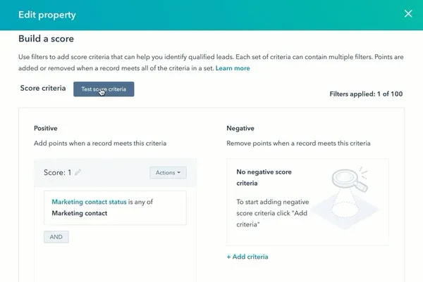Under Settings → Properties → HubSpot Score, add your rules. Consider building multiple custom score properties if you operate distinct models for inbound, outbound, or product-led growth. Inside each property, stack positive and negative logic for balance.