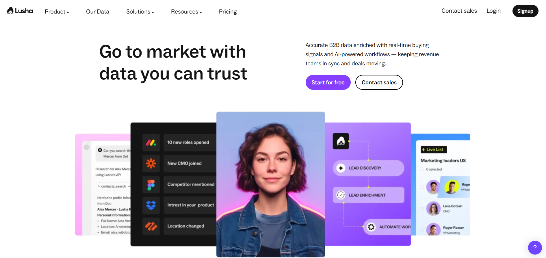Lusha provides contact data and buyer intent insights through its Chrome extension and web app. It's best for small teams needing quick access to potential leads and decision-makers.