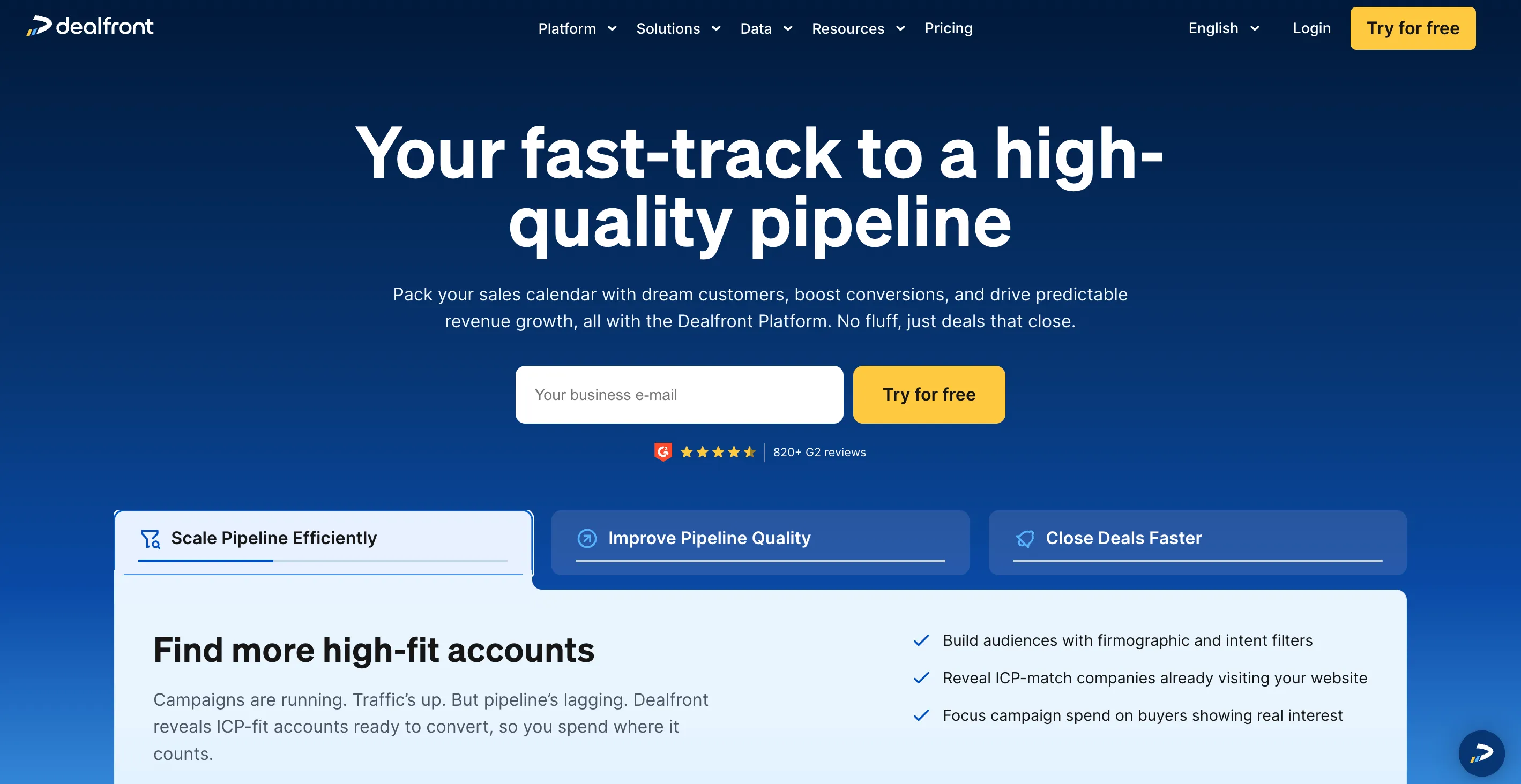 Accuracy depends on traffic volume and network setups (e.g., VPNs can obscure identity), so expect the strongest results on mid-to-large traffic sites. Dealfront isn’t a sequencer or ad platform; it’s best as the detection layer in an ABM motion.