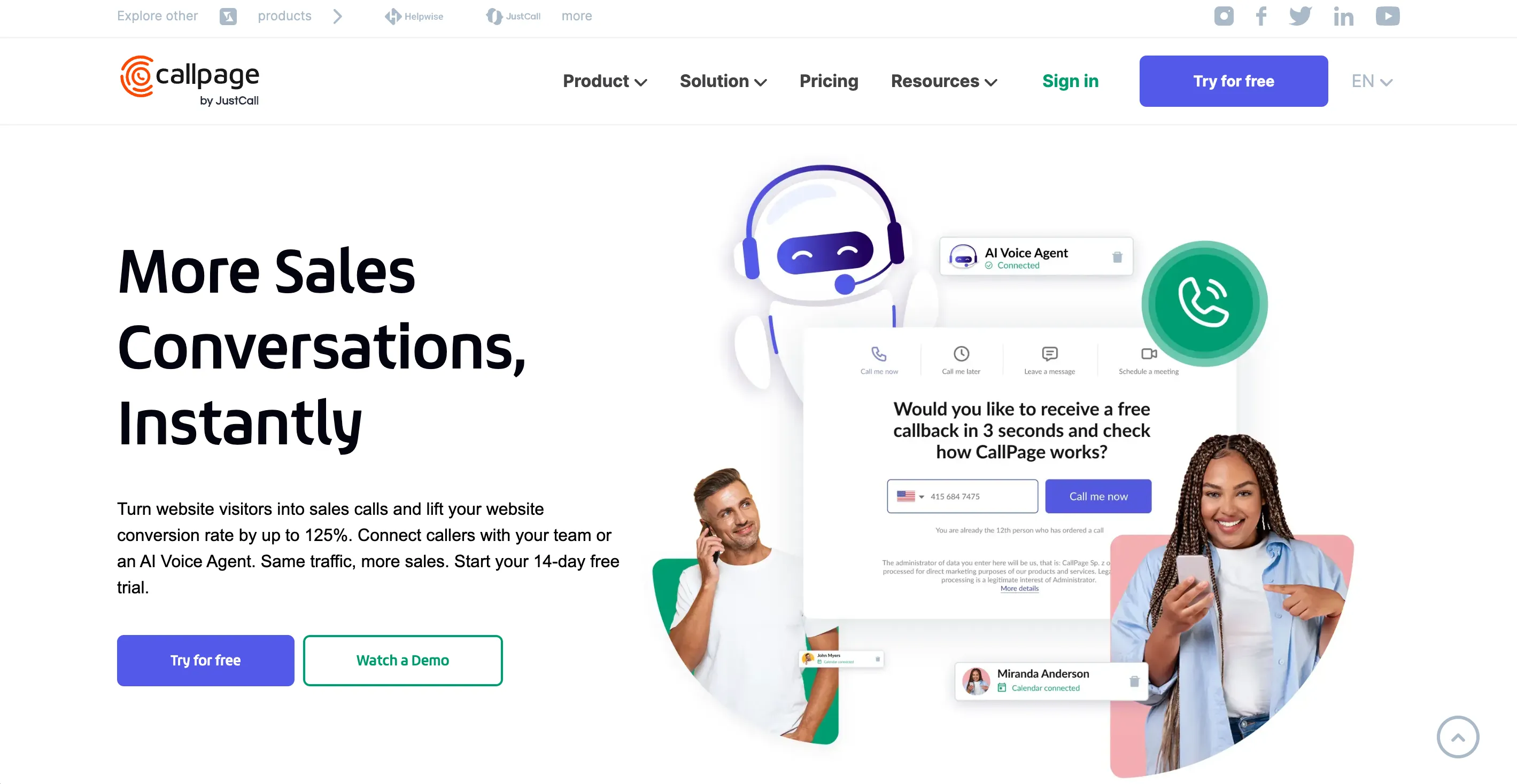 CallPage adds an instant callback widget to your site, converting high-intent visitors into live conversations within seconds. When a prospect enters a number, the system dials both sides and connects them automatically, shrinking response time and lifting connect rates.