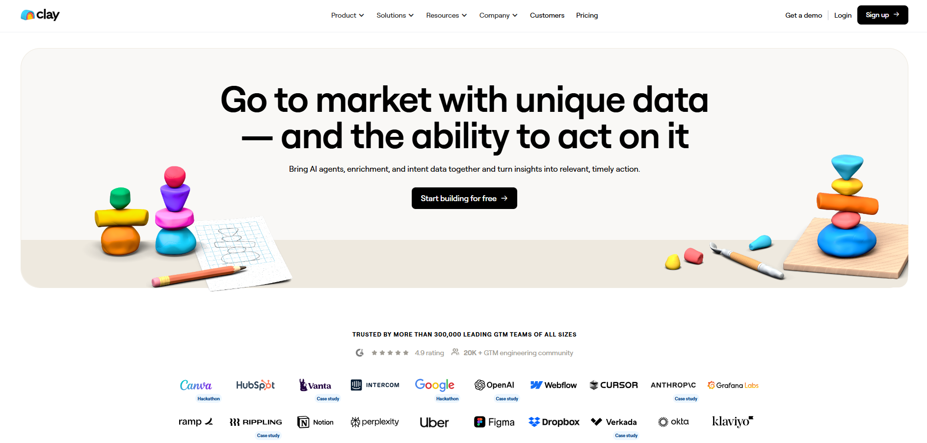 Clay automates data enrichment and personalization through workflow APIs and integrated lead scoring. The platform pulls data from multiple sources, including LinkedIn, Clearbit, and Crunchbase to create comprehensive prospect profiles with demographic and firmographic attributes for targeted campaigns.