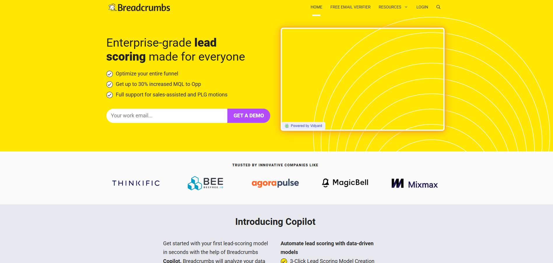 Breadcrumbs.io specializes in machine learning-powered lead scoring with custom algorithms tailored to your specific sales process and customer data. The platform analyzes firmographic, technographic, and behavioral signals to create scoring models that adapt to your ideal customer profile. It serves mid-market to enterprise sales teams with enough historical data to train effective machine learning models. Pricing operates on multiple plan levels based on contact volume and feature requirements.
