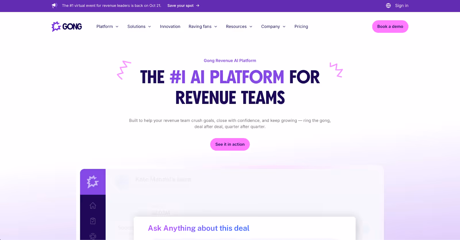 Features: Gong’s AI-powered conversation intelligence captures and analyzes every customer interaction to reveal deal momentum and risks.