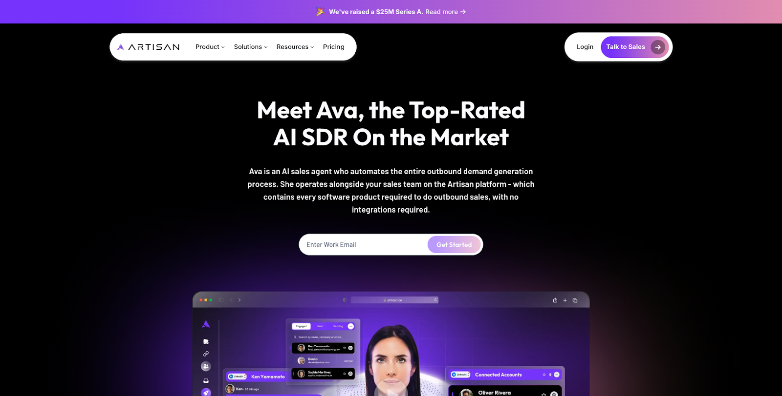 Artisan's AI sales agent, Ava, is a virtual AI SDR designed to automate the entire outbound demand generation process. She operates within the Artisan platform to find and research leads, craft hyper-personalized outbound messages, and engage interested prospects.
